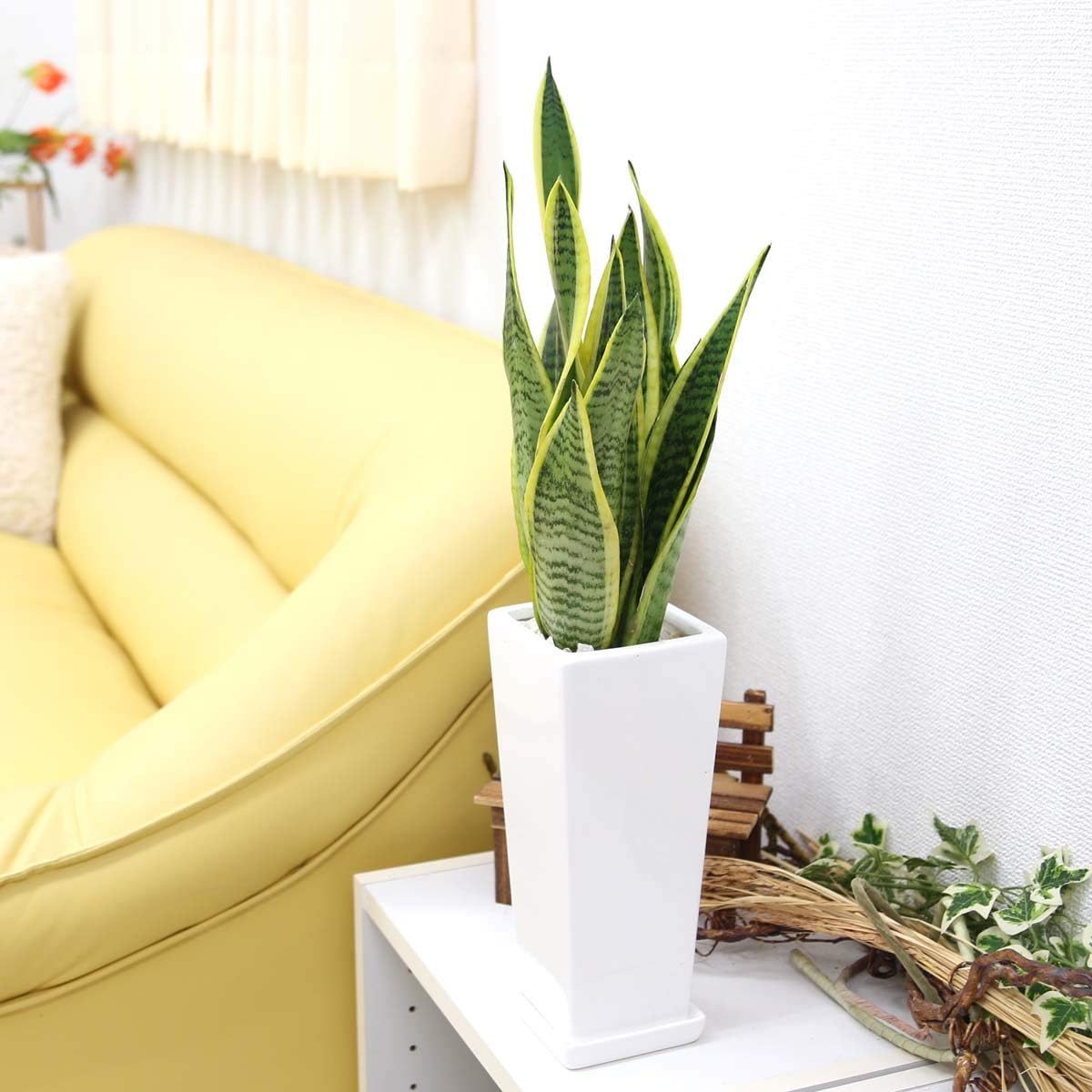 新鮮さが違います♪マイナスイオンをたくさん出す観葉植物として人気になったのがサンスベリア。存在感もバッチリ!お手入れも簡単なので、贈り物やリビングルームのインテリアとしても最適。より一層、豪華に見えるスクエア形のホワイト陶器鉢植えがスタイリッシュで、スマートな雰囲気と葉っぱの独特な模様もGood!比較的、お手入れも簡単なので寒さなどに注意すると管理も簡単です。