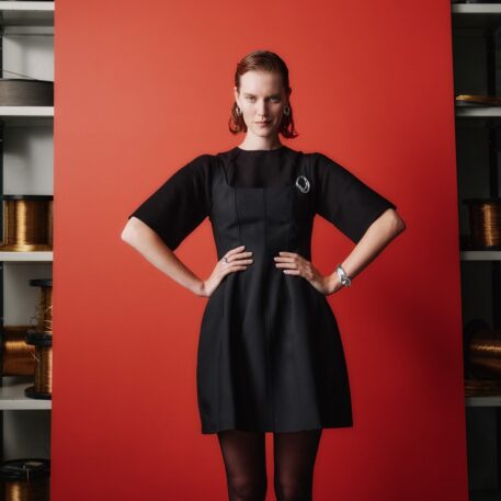 トップス:CINOH、パンツ:Theory、シューズ:CAMPER、バッグ:MUUÑ、サングラス:MYKITA、ジュエリー:oeau (全て編集長私物)