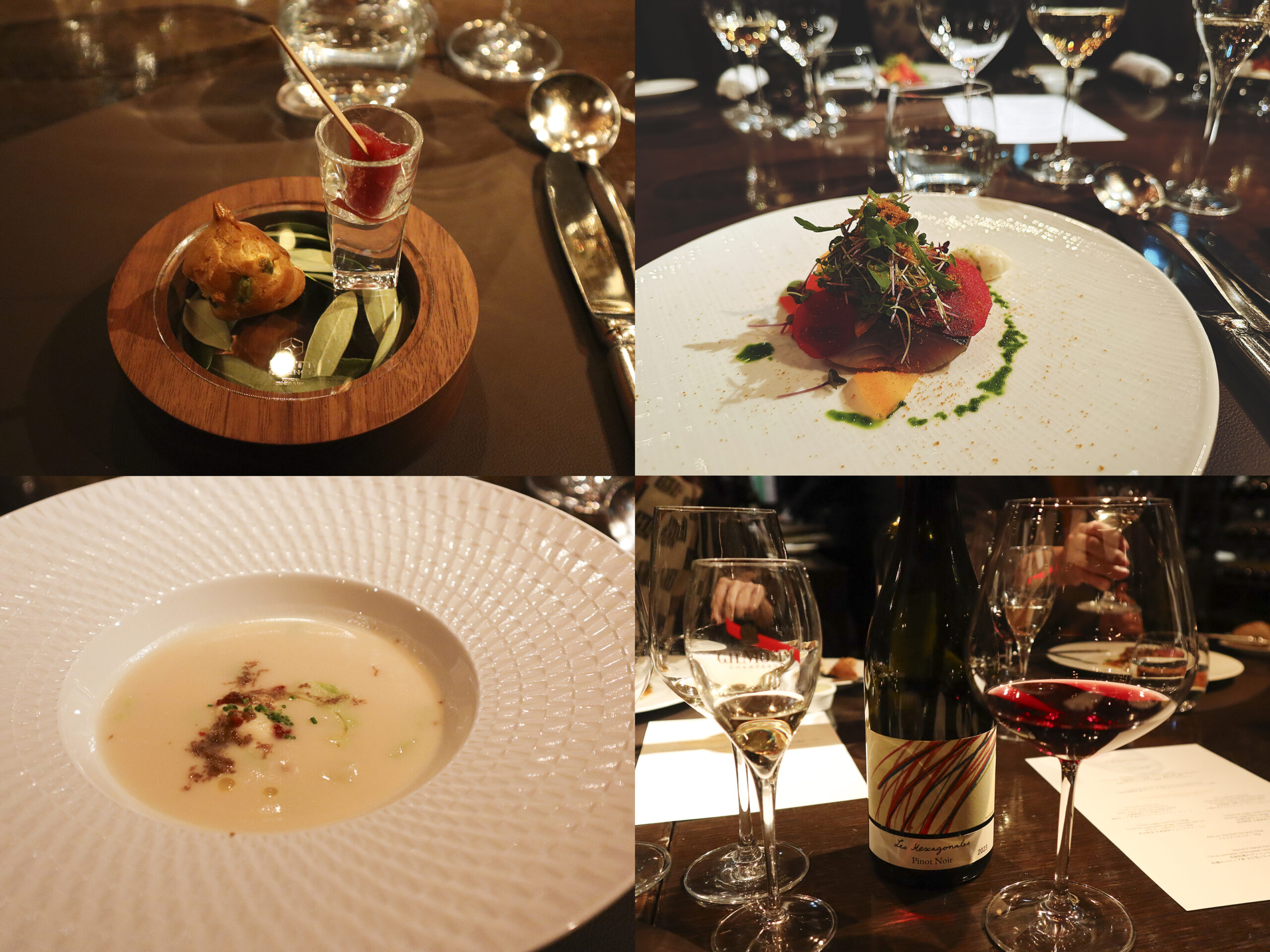 シャンパンとその⽇の⾷材から考えられた⼩さなアミューズ”はじまりの⼀⽫”からスタート。地元⾷材を活かした⾹り豊かな2種の前菜、近隣漁港から直送される真鯖のマリネに薫香と蒸し鮑、小田原西湘野菜の蕪(かぶ)と貝の出汁が冬らしいヴルーテには、食感が楽しい白菜に黒トリュフの香りも。地の食材とワインとのペアリング楽しみながらいただきます。