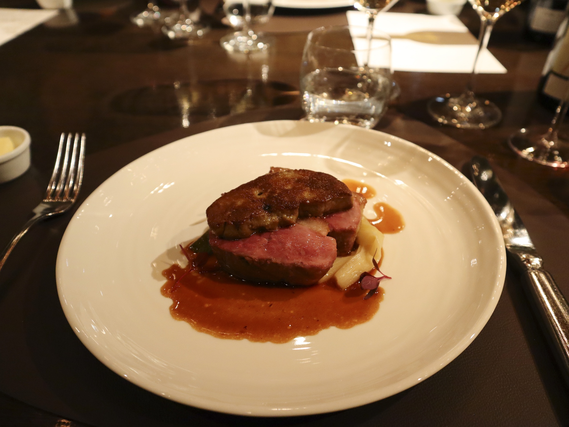 メインのお魚とお肉、4種類の中からセレクトしたのは”合鴨ムネ肉のロースト”とペアリングワインはレ ゼキサゴナル ピノ ノワール(赤)。フォアグラのソテーをトッピングしていただきます。添えられた九条ネギと、キャラメリゼされたマーマレードの爽やかなソースは最高のバランス!