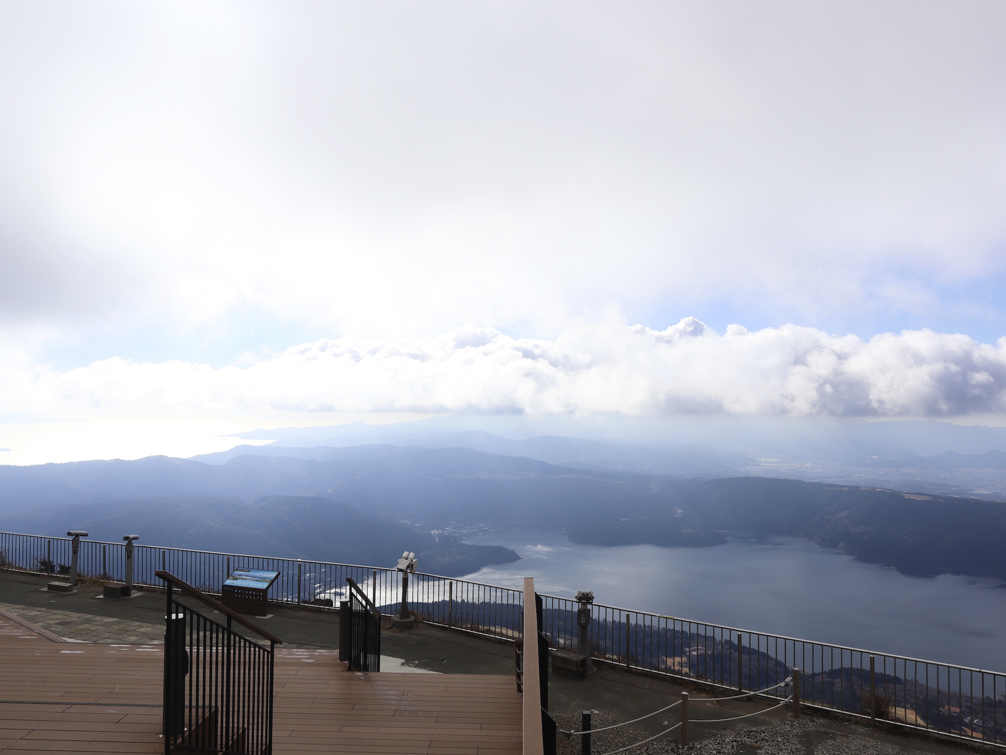 富士山や相模湾まで見渡せる山頂。冬の方が富士山が綺麗に見える機会が多いとのこと。箱根の開運旅には欠かせない景色です。