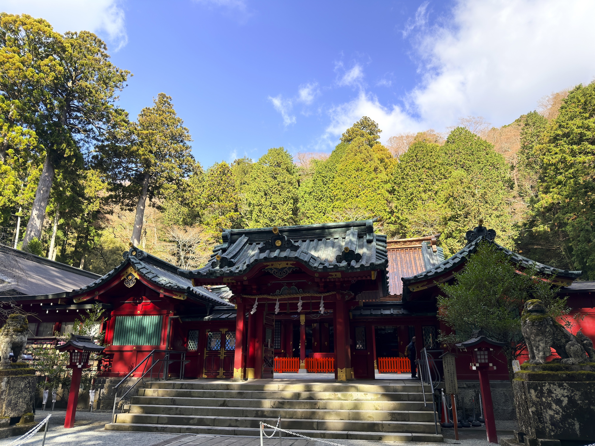 関東屈指の神社「箱根神社」御神木に囲まれた色鮮やかな本殿。開運・縁結び/良縁・交通安全・商売繁盛・厄払い・合格祈願・安産祈願・心願成就・武芸上達・立身出世など、あらゆる面でのご利益を得られるとのこと。