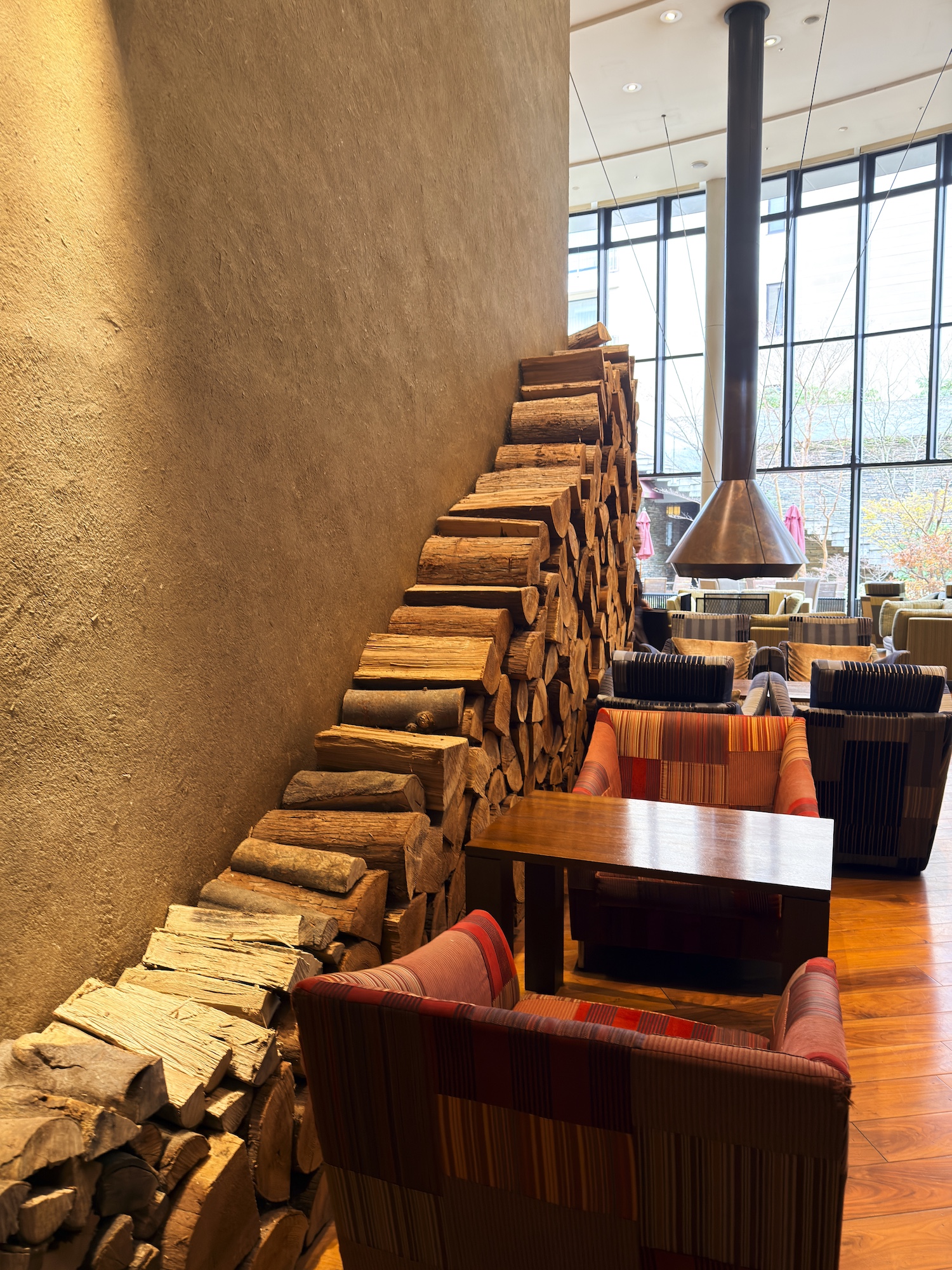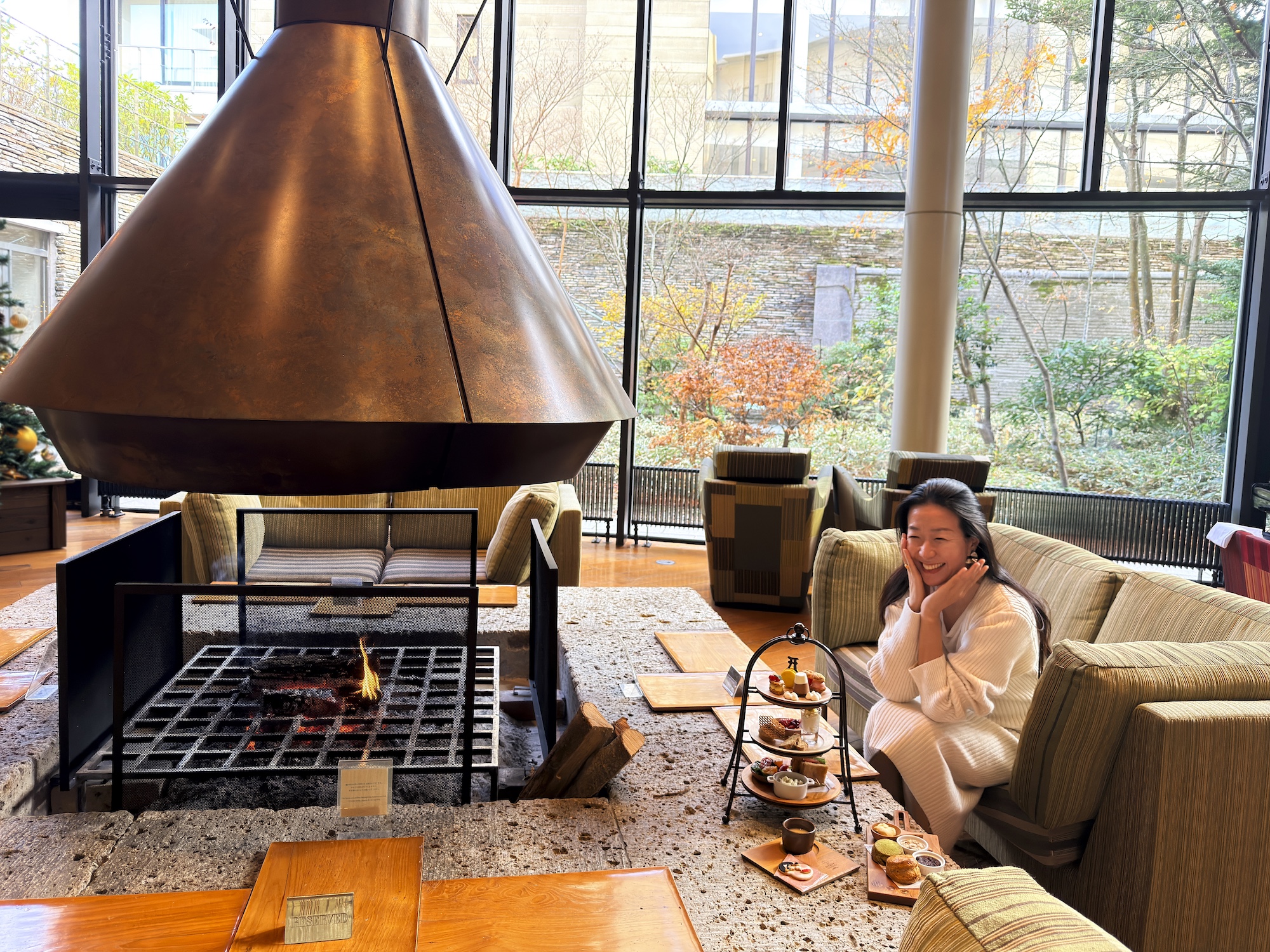 ハイアット リージェンシー 箱根の中でも、薪と暖炉の温かみと自然に囲まれた「リビングルーム」は、まるで自宅にいるような気分でゆっくりとくつろげる“箱根の我が家”に欠かせない場所。(※取材時はクリスマス前のため、ツリーがディスプレイされています。)