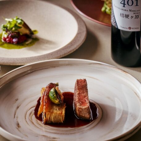 シャンパンとその⽇の⾷材から考えられた⼩さなアミューズ”はじまりの⼀⽫”からスタート。地元⾷材を活かした⾹り豊かな2種の前菜、近隣漁港から直送される真鯖のマリネに薫香と蒸し鮑、小田原西湘野菜の蕪(かぶ)と貝の出汁が冬らしいヴルーテには、食感が楽しい白菜に黒トリュフの香りも。地の食材とワインとのペアリング楽しみながらいただきます。