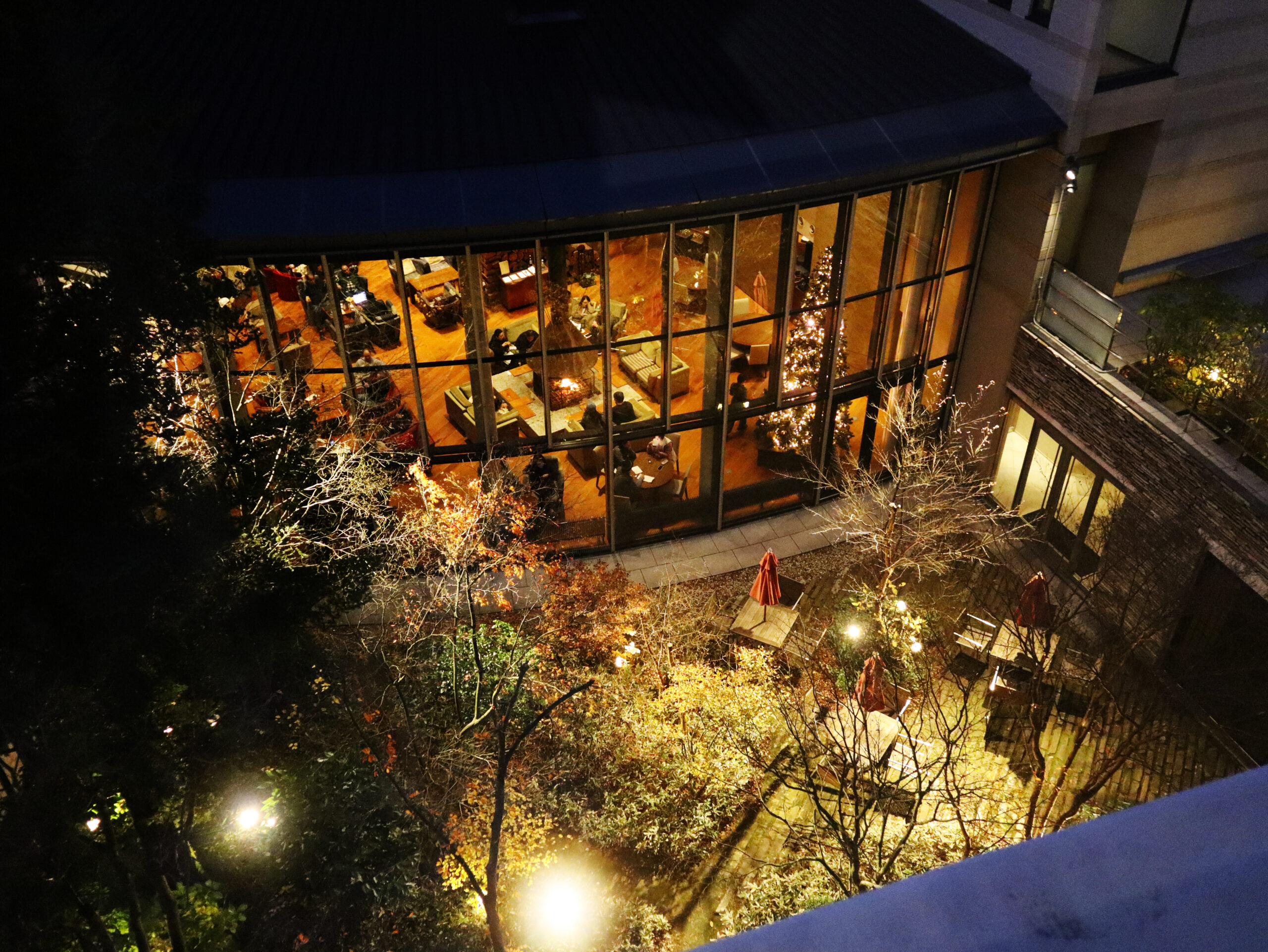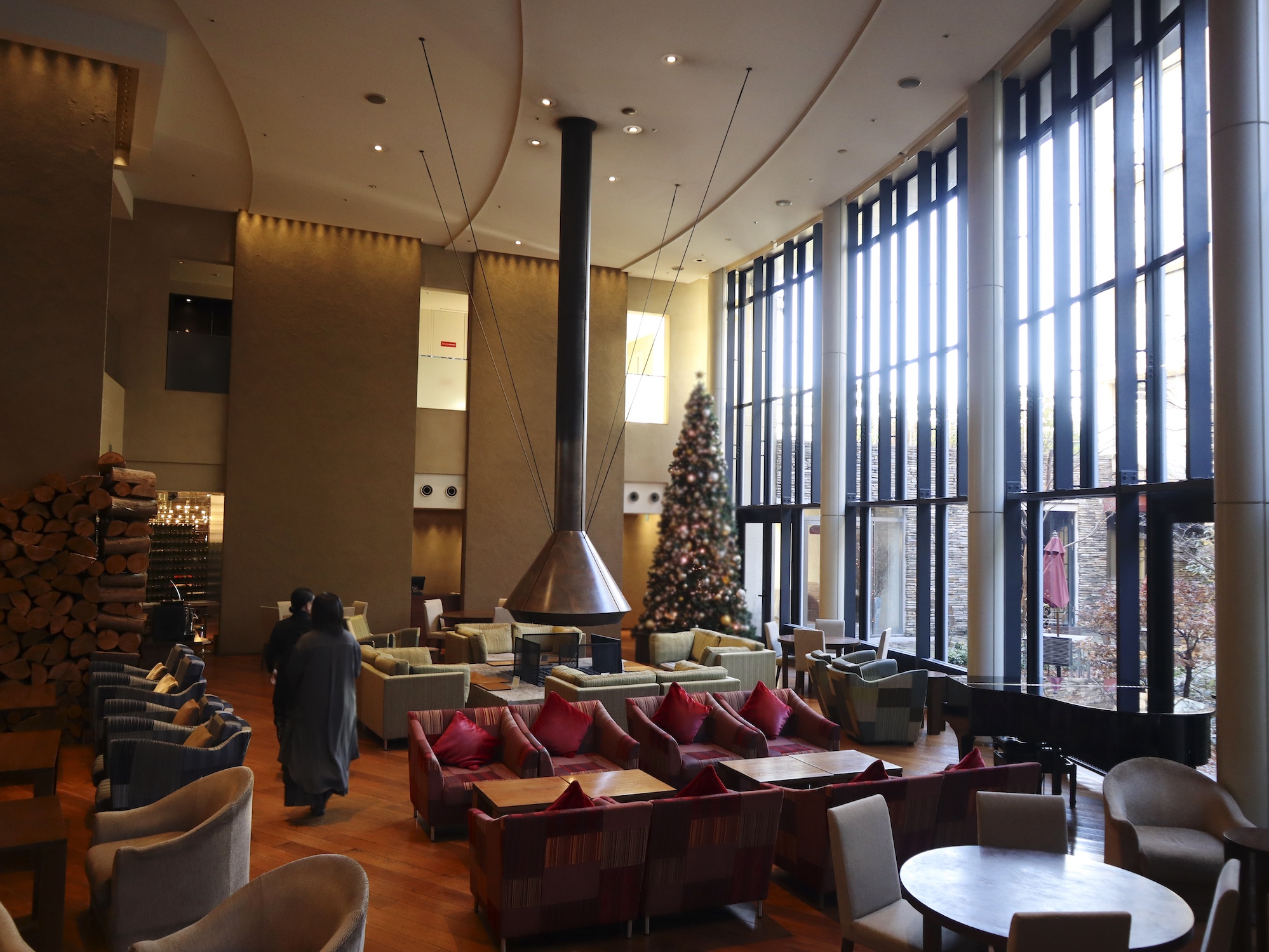 ハイアット リージェンシー 箱根の中でも、薪と暖炉の温かみと自然に囲まれた「リビングルーム」は、まるで自宅にいるような気分でゆっくりとくつろげる“箱根の我が家”に欠かせない場所。(※取材時はクリスマス前のため、ツリーがディスプレイされています。)