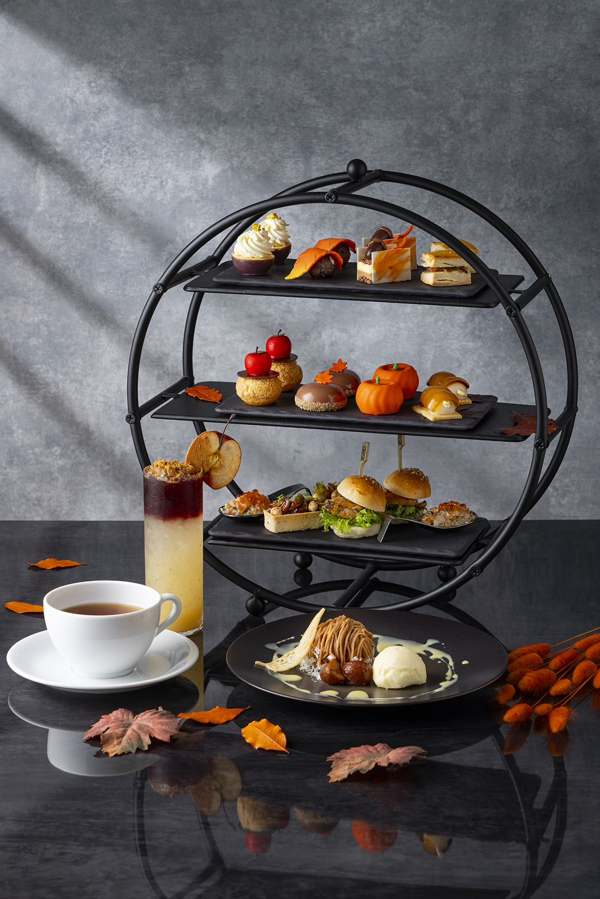 今季は栗、芋、かぼちゃといった愛される秋の素材をふんだんに使用しトリュフの風味を加えるなど、見た目にも味わいにも”実りの秋”を感じられるラインナップに仕上げている。彩り豊かなスイーツとセイボリーが織りなす、紅葉のように深まる季節の味覚を楽しむことができる。また、より贅沢な”極上体験”を演出するプレミアムプランでは、ゲストの目の前で芳醇な黒トリュフを削って仕上げる「トリュフモンブラン」が登場。香り高く口の中でとろけるような極上の一皿で五感を満たす特別なひとときを届けてくれる。