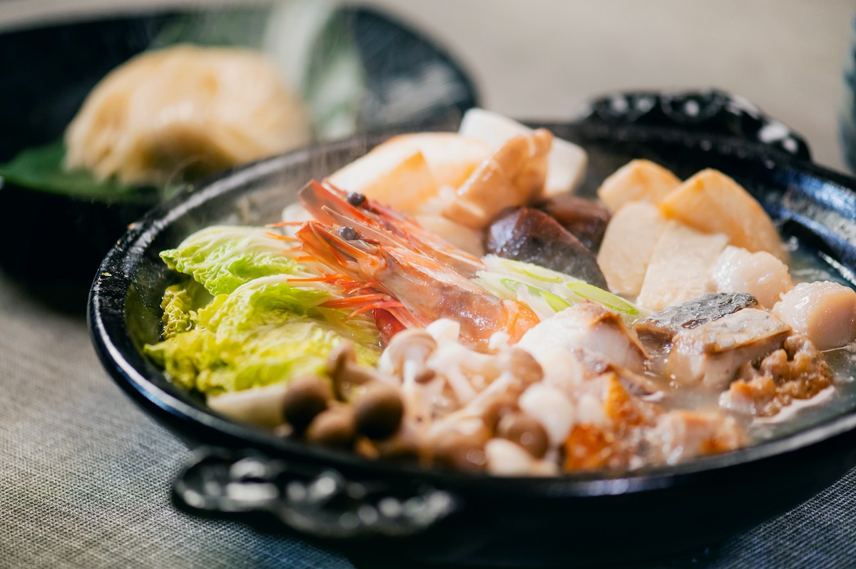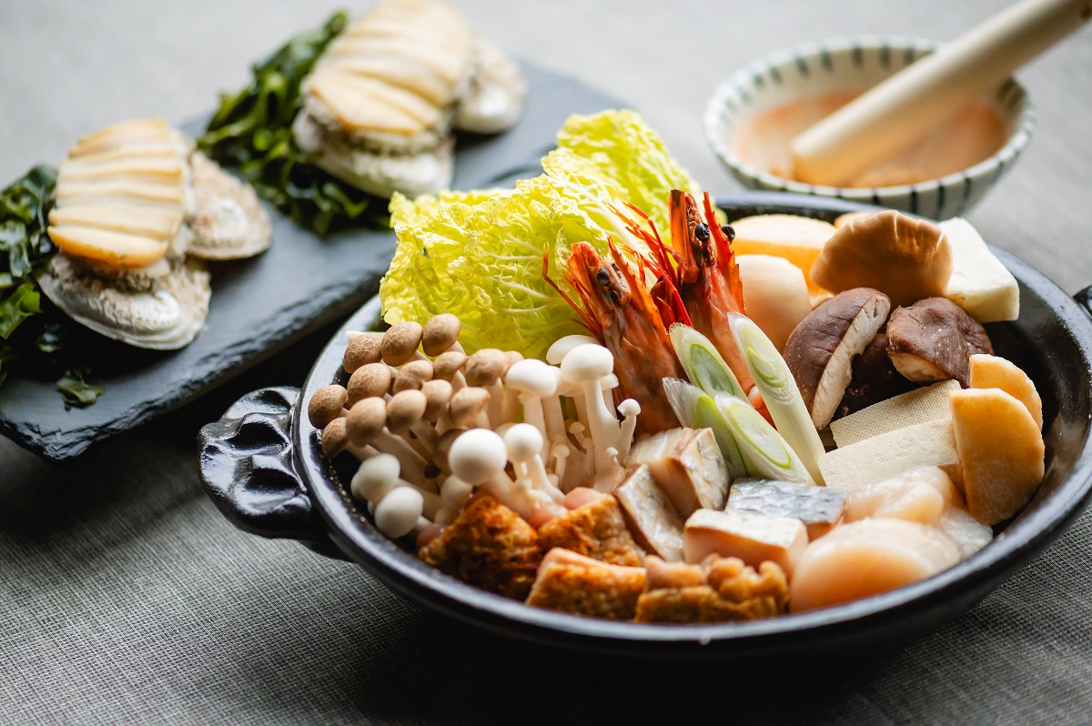 このプランでは、五行の”金”の象徴の色である白い食材を使った養生鍋が用意されている。大根や蓮根などの白い根菜と、鶏肉、エビ、ホタテなどの高タンパクな白い食材を組み合わせ、松の実と白ごまのタレなど、調味料も白にこだわり、肺を潤し養う食事を提供する。
