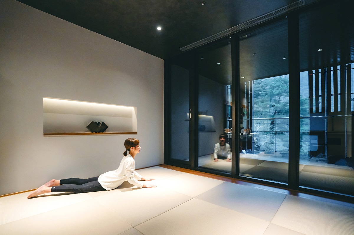 月見の客室の畳の空間で、深呼吸に合わせたストレッチ「温泉伸呼吸」をスタッフがレクチャー。腹式呼吸を取り入れたこのストレッチは、お風呂の中で行うことを目的としたストレッチで、ゲストは自身で温泉に入る際にも、行うことができる。温泉に入りながら行うことで、水の浮力を感じながら、呼吸を整え、筋肉をリラックスさせ、体をほぐしてくれる。さらに炭酸水素塩泉の温泉は、肌を潤す美肌の湯とも呼ばれており、秋の乾燥対策にもつながっている。