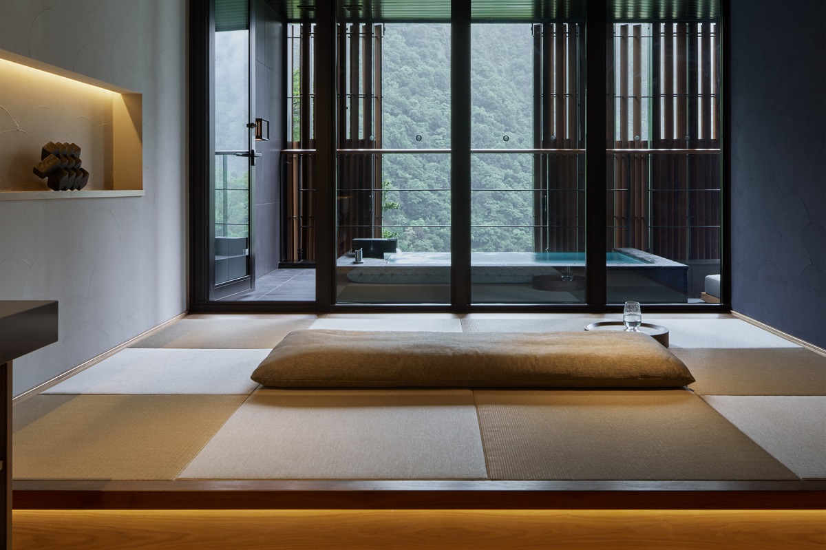 客室にある源泉かけ流しの温泉に入浴することで、秋の乾燥しやすい時期に、体を温めて肌を潤し、血行や肌の新陳代謝を促進。温泉は筋肉の疲れを和らげるだけでなく、呼吸器系を整え、秋の乾燥によるトラブルの改善を助けてくれる。その後、ローズオイルと保湿ジェルマスクを使い、足先から頭皮まで全身をケアするトリートメント「潤」を。このトリートメントにより、肌に潤いを与え、呼吸を整えることで、深いリラックス効果をもたらしてくれる。