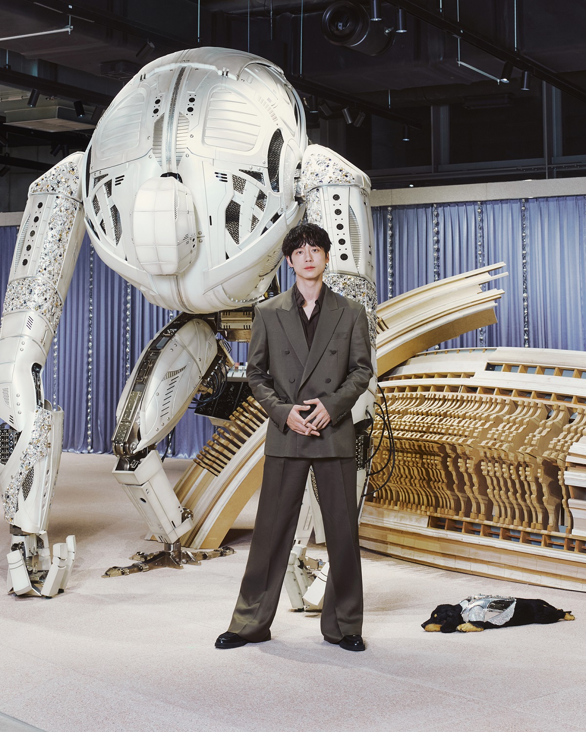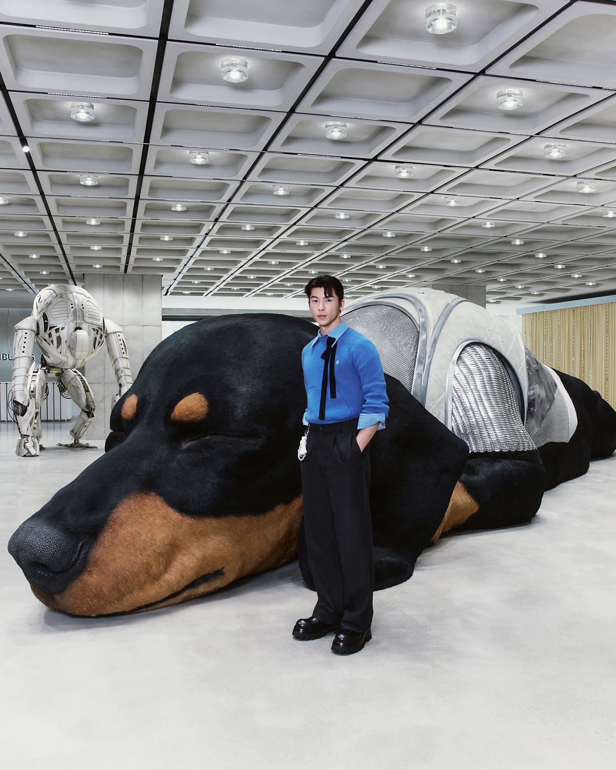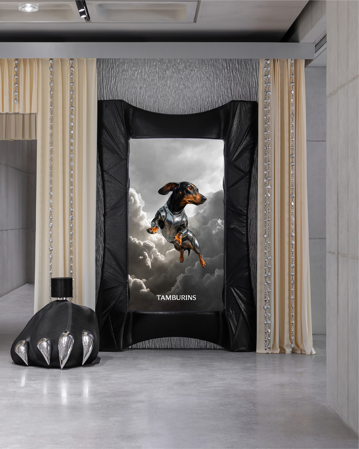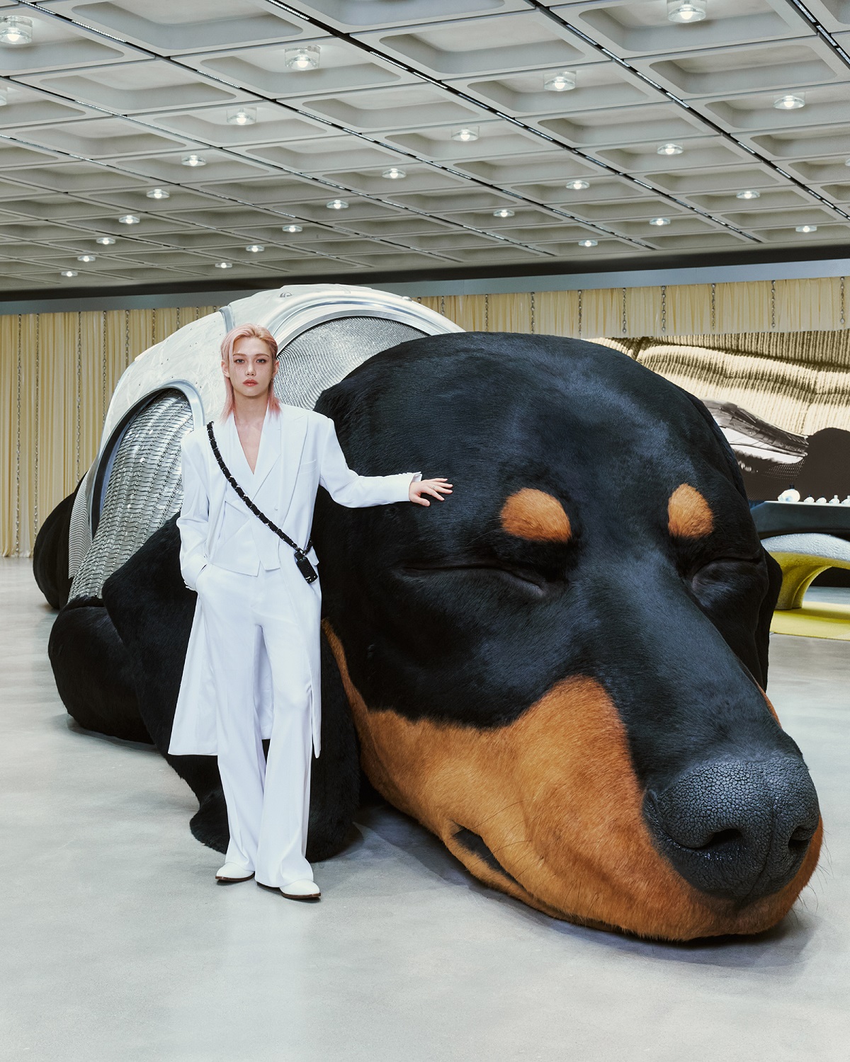 HAUS NOWHERE SEOULの「SUNSHINE」ポップアップは、親会社IICOMBINED(アイアイコンバインド)傘下のブランドがこれから多様なプロジェクトを広げていくHAUS NOWHERE SEOUL 1階の「PROJECT SPACE」にて初めて披露されるプロジェクトであり、TAMBURINSの視線で見た夢と現実の境界を表現している。エントランスに足を踏み入れると、13メートル規模の大型ダックスフントのオブジェ「SUNSHINE」が来場者を出迎える。この「SUNSHINE」オブジェは、IICOMBINED LABが積み重ねてきたアニマトロニクス技術と極めて写実的な表現が集約された作品となっている。精巧なエンジニアリングにより、筋肉の微細な震えや呼吸までも再現し、人工毛の繊細な質感を加えることで、まるで実際の生命体と向き合っているような没入感を与えている。