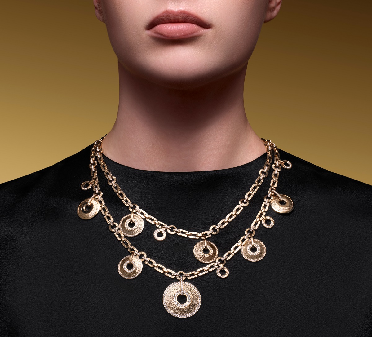 新作のハイライトとなるのは、「ピース・ド・レジスタンス」。優雅さと高揚感が調和したピアジェの「エクストラレガンザ」を体現する、大胆で多面的なタリスマン。まば ゆい太陽のエネルギーを纏ったように、8カラットのダイヤモンドを散りばめたメダリオンが、フォルムとチェーンが織りなす優美な調和の中で、身に着ける人を光と喜び、そして生命力で包み込む。輝きと感動、そして揺るぎない個性を宿すこれらのカリスマ的なクリエイションは、進化し続けるピアジェの「HOUSE OF GOLD」の力強い新たな幕開けを告げていく。それはピアジェのサヴォアフェールの結晶。ゴールドは夢を表現する手段であり、想像力によってその魅力は無限に広がっていく。