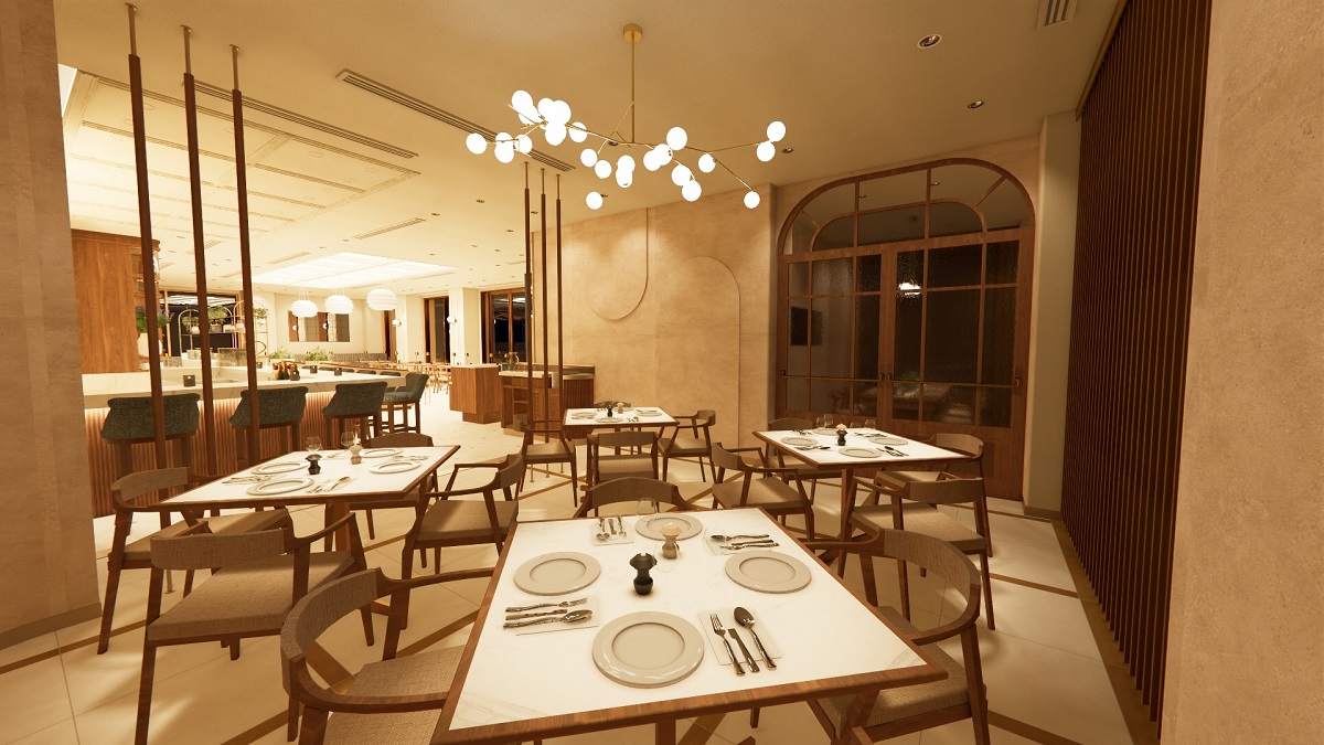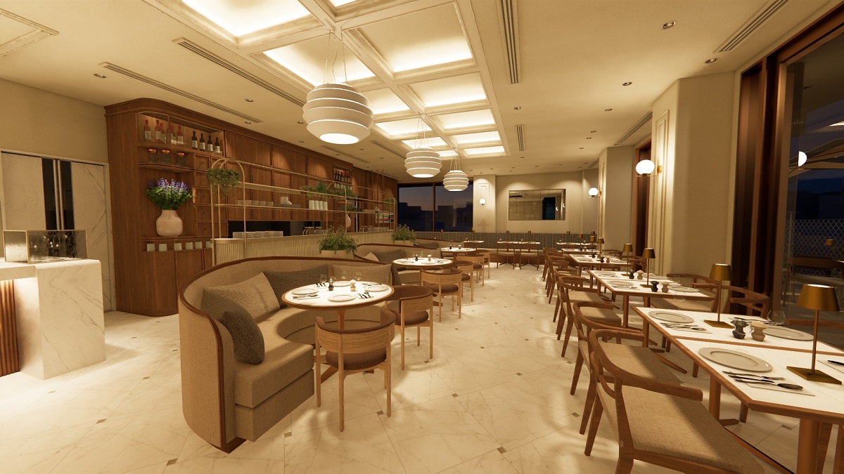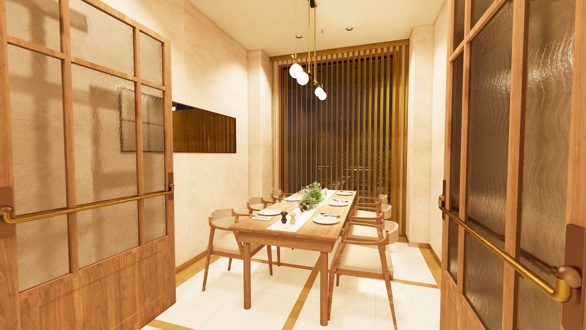 表参道の上品でクラシカルな街並みに溶け込みながら、木や石目調の自然素材を取り入れた柔らかな空間。ブルーをアクセントカラーにすることで、落ち着きの中にさりげない華やぎを添えている。陽射しが差し込む昼間は、爽やかな光と風が心地よい時間を演出し、ナイトタイムには間接照明が空間をやわらかく包み込み、サラベス表参道店ならではの特別な食のひとときを楽しむことができる。昼夜、それぞれが異なる表情を見せながら、どの瞬間も記憶に残る贅沢な時間をお届け。さらに、パーティールーム、プライベート感あふれる個室を備えるほか、都会の真ん中でありながら喧騒を忘れさせるテラスでは、そよぐ風とともに過ごす開放的な時間も楽しむことができる。