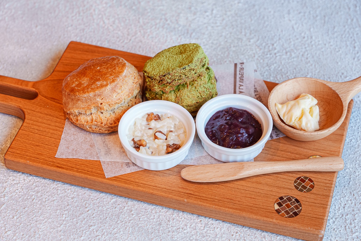スターターは、提供時期に合わせ2種が用意されている。12⽉25⽇までは、⾦運を引き寄せる⼒があると⾔われるチョコレートに、エネルギーの活性化や邪気払いの効果があると⾔われるスパイスをプラスし、優しい⽢さに仕上げた「ホットチョコレート」と「クリスマスツリーのアイシングクッキー」を。12⽉26⽇以降は、体と⼼を整える開運の⼀杯と⾔われる⼿作りの「⽢酒」と「福笑いのアイシングクッキー」が用意されている。⽢酒は、⼀般的なものよりも⽢さを控えめにすることで、すっきり感と⾵味を楽しめるオリジナルテイスト。アイシングクッキーは、ゲスト⾃⾝で組み⽴てる楽しさを提供したいという思いから、セパレートのパーツとなっている。テーブルの上で、自分だけのクリスマスツリーや福笑いを完成することができる。定番として⼈気の⾼い「全粒粉スコーン」に加え、シーズン限定のスコーンには、⾃然の息吹をイメージさせる美しいグリーン⾊の抹茶を⽤い、中に豊かさと繁栄の象徴として幸せを呼び込むと⾔われる開運フード、イチジクをセミドライで忍ばせている。