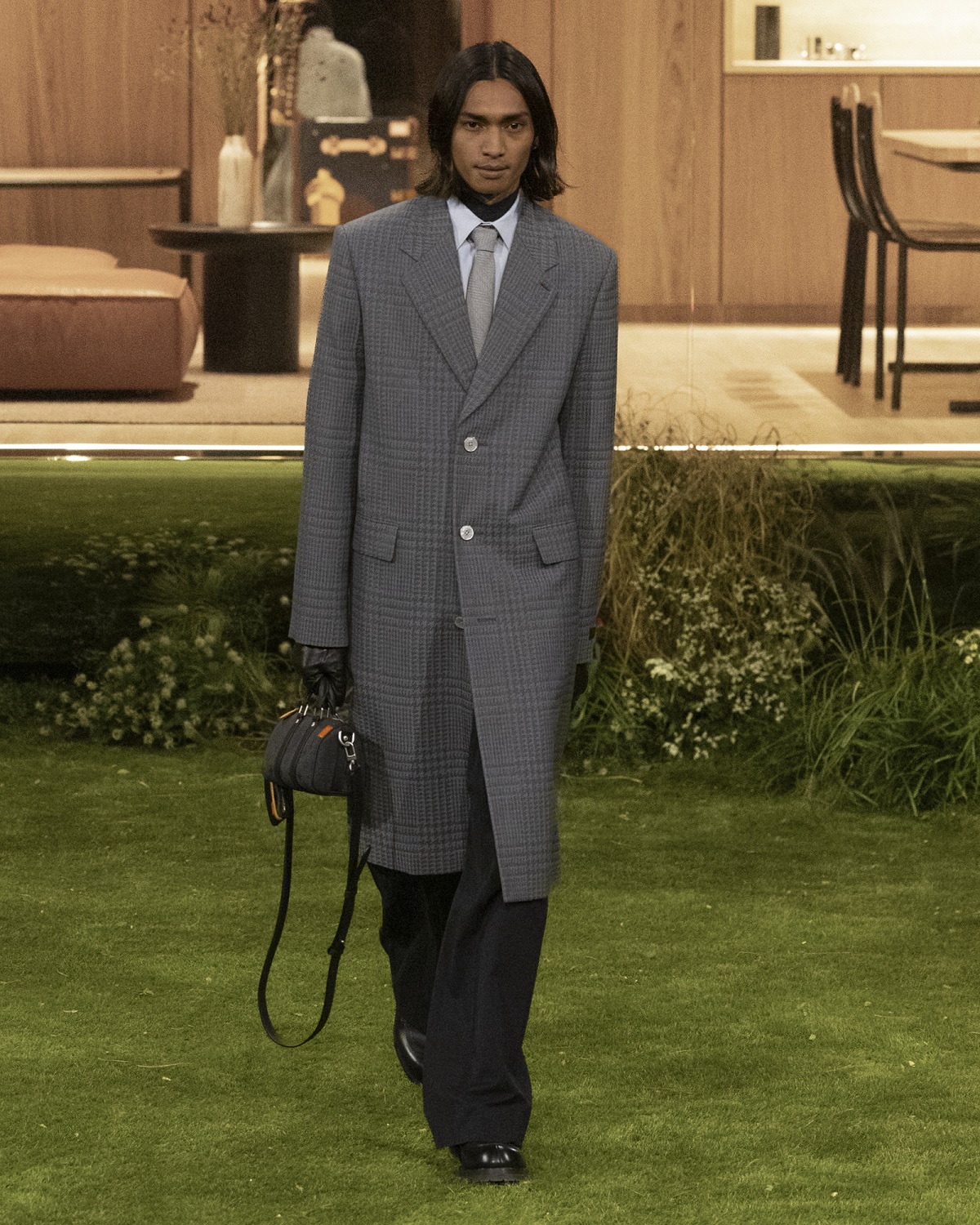 平野紫耀は、「会場に入った瞬間、建物が目に飛び込んできて、まず強いインパクトを受けました。同時に、香りが広がってきて、今回もこれまで以上に細部までの強いこだわりを感じました。まず家のセットの中で身支度を整えるシーンから始まり、そこからランウェイへとつながっていく流れがとても印象的で、ストーリー性のある演出がすごく素敵でした。”ダンディ”というテーマの中で、スポーティな要素も取り入れながら、決してスポーティーに寄りすぎず、しっかりとダンディなエッセンスが感じられたり、とても絶妙なバランスで、魅力的なアイテムがたくさんありました。」と話している。
