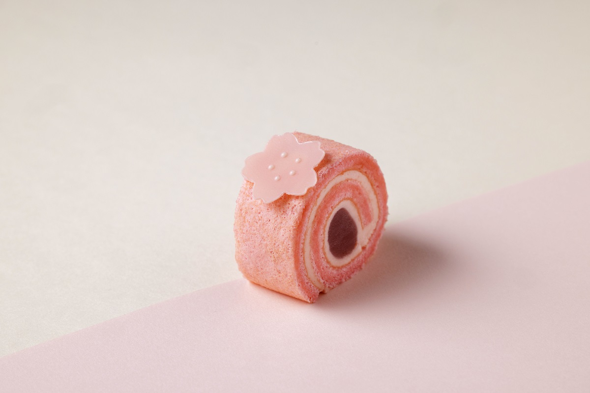 「桜ロールケーキ」は、桜がほのかに香る軽やかなスポンジ生地に、上品な甘さの白あんと桜風味のホワイトチョコレートクリームを重ね、丁寧に巻き上げている。仕上げにあしらった桜形のチョコレートが、和と洋の美しい調和を象徴する華やかな一品。淡い桜色が印象的な「桜マカロン」は、繊細な食感のマカロン生地で、桜の葉の芳香をまとったクリーミーなガナッシュと、酸味の効いたラズベリージャムが包み込まれている。口に含むと、桜の香りと果実の爽やかさが静かに広がり可愛らしい見た目に心躍る。「抹茶ムース 桜 ストロベリー」は、桜クリーム、抹茶スポンジ、苺のコンポートを幾重にも重ねた、なめらかで艶やかなムースドーム。バニラがほのかに香るサブレ生地の上で、抹茶の奥深い旨みと苺の瑞々しい酸味が調和し、ベルベットのように柔らかな口どけとともに、豊かな余韻を残す。さらに、「桜シュークリーム」は、ふんわりと焼き上げたシュー生地に、桜のディプロマットクリームと軽やかな桜のシャンティ、さらにフルーティーなチェリーゼリーを贅沢に忍ばせている。桜の花びらをあしらい、視覚にも春の気配を感じさせる一品に。今回のスペシャルな一皿は「ルビー チョコレートコーン」。ピンク色が美しいルビーチョコレートのコーンに、優雅な香りのローズガナッシュと、ほのかな甘みのあずきを組み合わせている。サクサクとした食感と、ルビーチョコレート特有のフルーティーな酸味が、洗練されたアクセントを添えている。