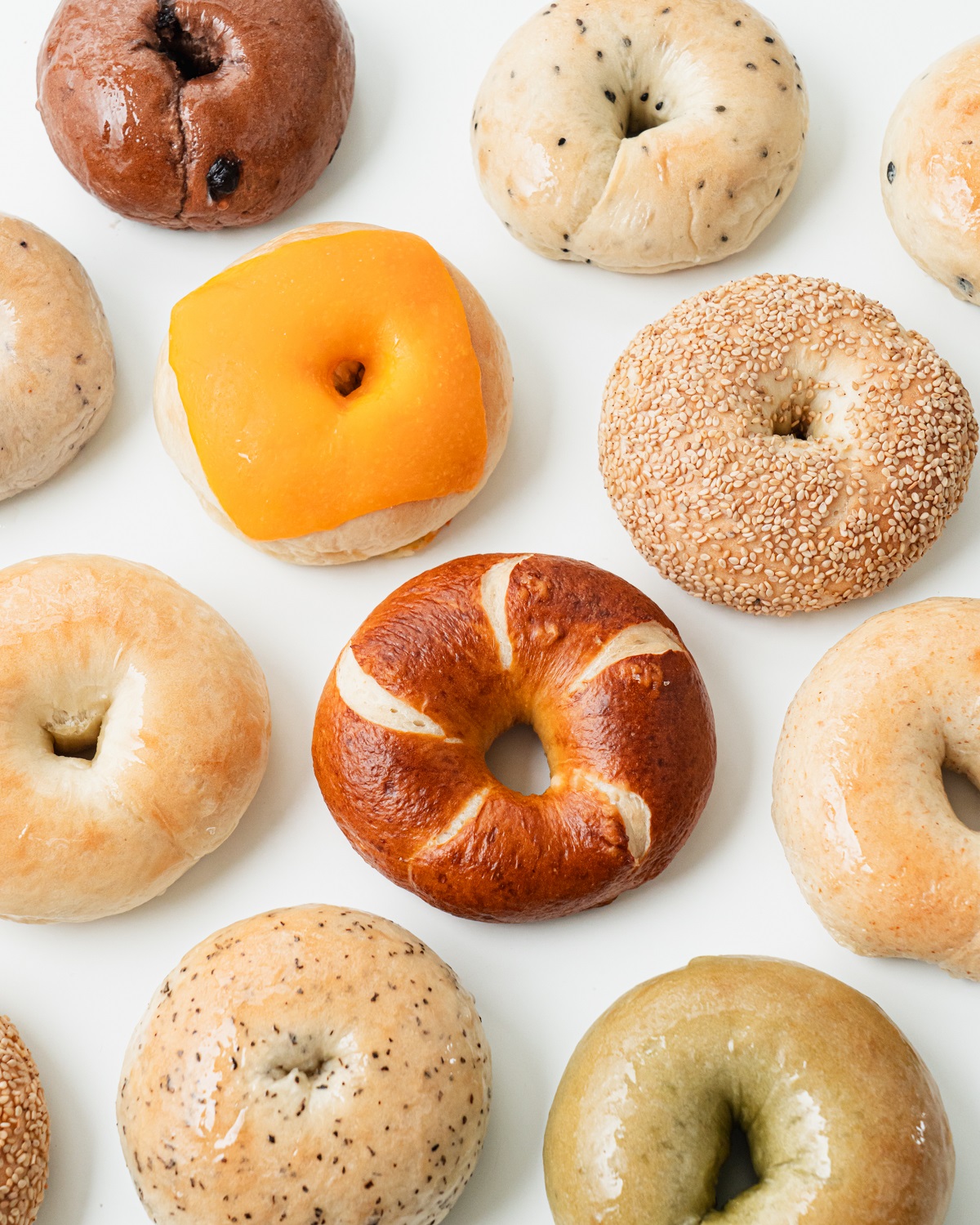 外は香ばしく、中はもちもちとした食感の「韓国式ベーグル」は、モチモチ食感なのにふわふわと軽くて美味しい!のが特徴。チョコチップやアールグレイなど10種類のフレーバーベーグル以外にも、具材を贅沢に挟んだ5種類のベーグルサンドを提供する。素材は国産小麦を100%、塩はミネラルがたっぷり入った国産天然塩を使用しており、生地には香料や着色料を一切使用していない。