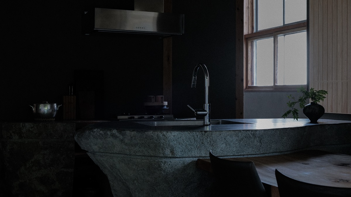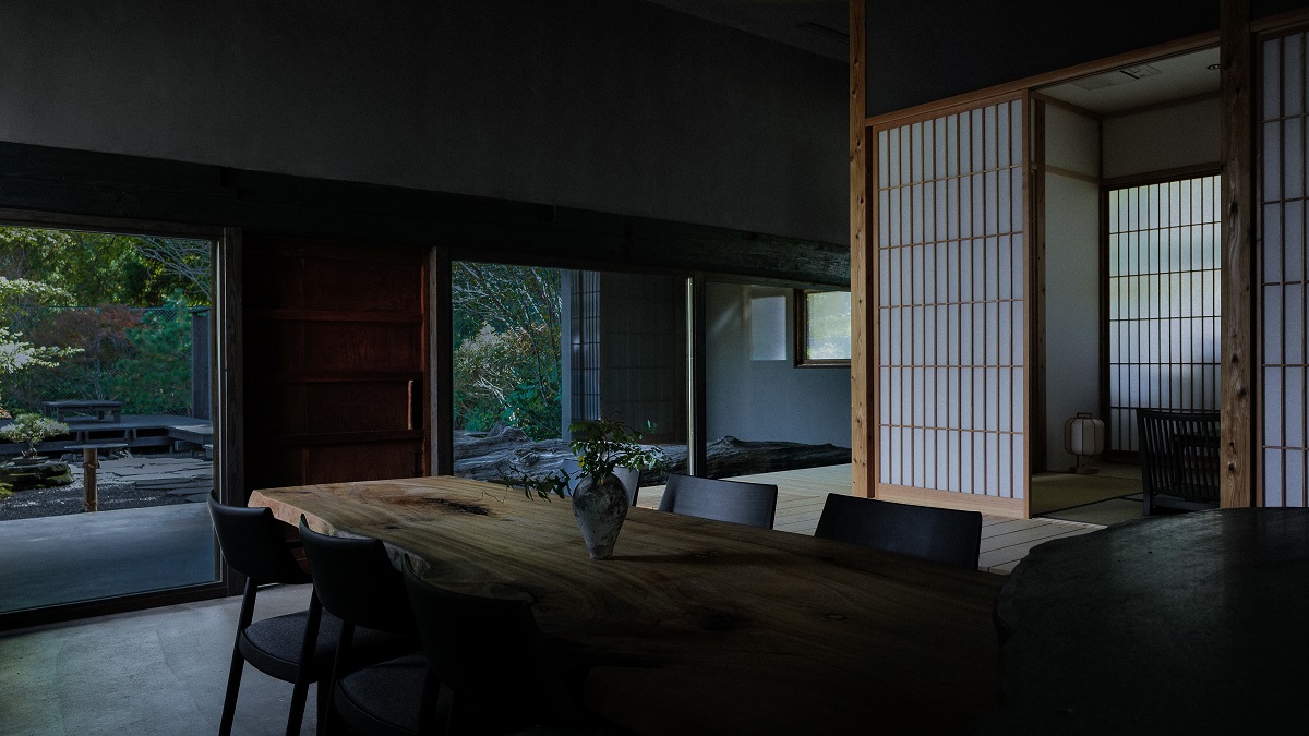 建物の扉を開けた瞬間、まず目に飛び込むのは圧倒的な岩の存在感を持つキッチン。地元の安山岩と御影石を組み合わせたカウンター、150年以上前のクスノキで仕上げたダイニングテーブルは、素材そのものが放つ力強さに思わず足を止めてしまう。料理をする人、待つ人、語らう人。それぞれの時間が一つの場でゆるやかに混ざり合い、滞在の中心を成している。その奥に広がる和室も、外の景色と緩やかにつながるよう設計され、どこにいても静けさがそっと寄り添ってくれる。和の設えで統一された客室、まろやかな高温が魅力のフィンランド式サウナ、そして源泉掛け流しの温泉に群馬県産の桧を贅沢に使用した浴槽。湯の温度を皆で確かめ、火の具合を相談する。そこに生まれる会話や間が、五感を少しずつ研ぎ澄ませていく。便利な世界では鈍ってしまった感覚が、熱、音、香り、静寂によって呼び起こされ、自分自身を深く理解するための「余白」が生まれる。